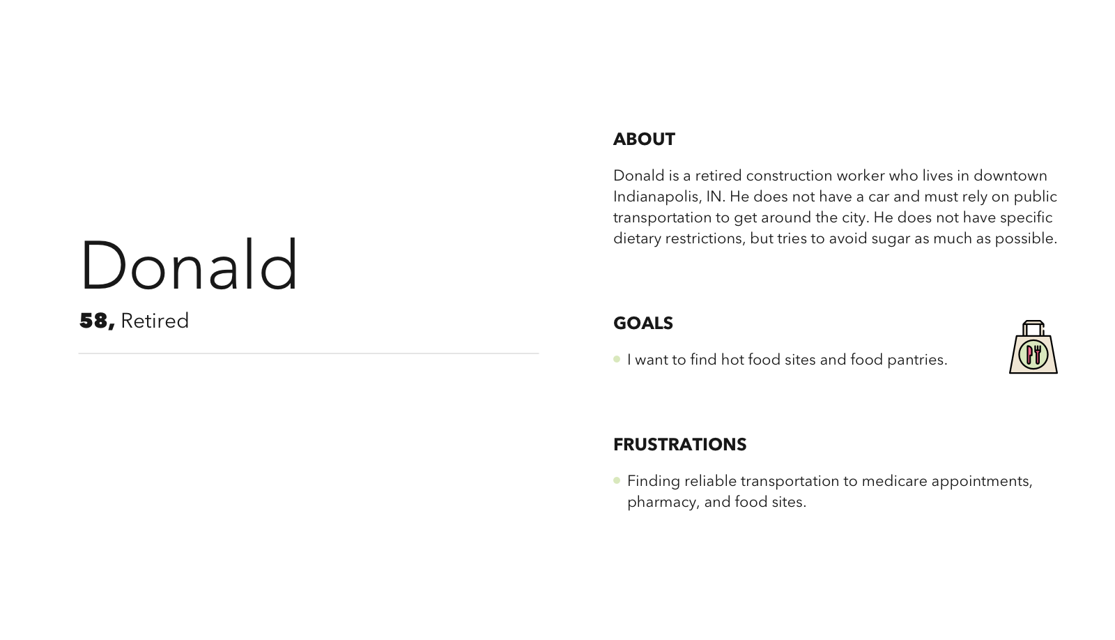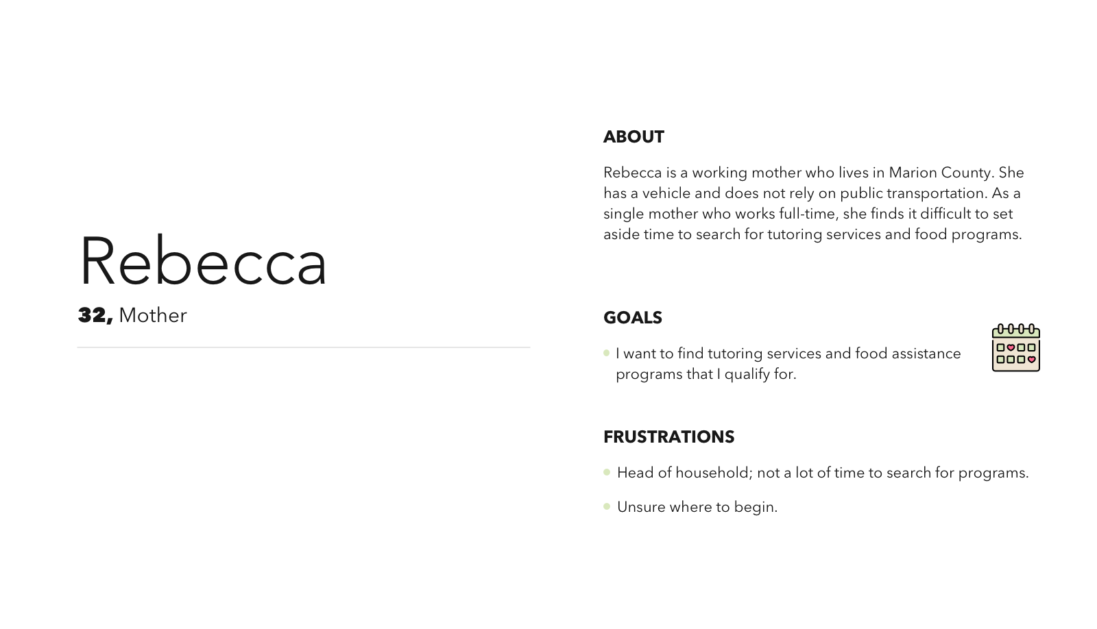 I conducted onsite interviews with Connect 211 operators to better understand citizen needs around food assistance. This provided an understanding of two key personas.